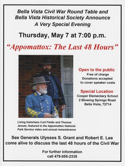 Come join us at the Cooper Elementary School at 2 Blowing Springs Road in Bella Vista for a very interesting program by two outstanding individuals recalling the discussion between General Ulysses S Grant and Robert E Lee. This program is free to the public and donations are accepted.